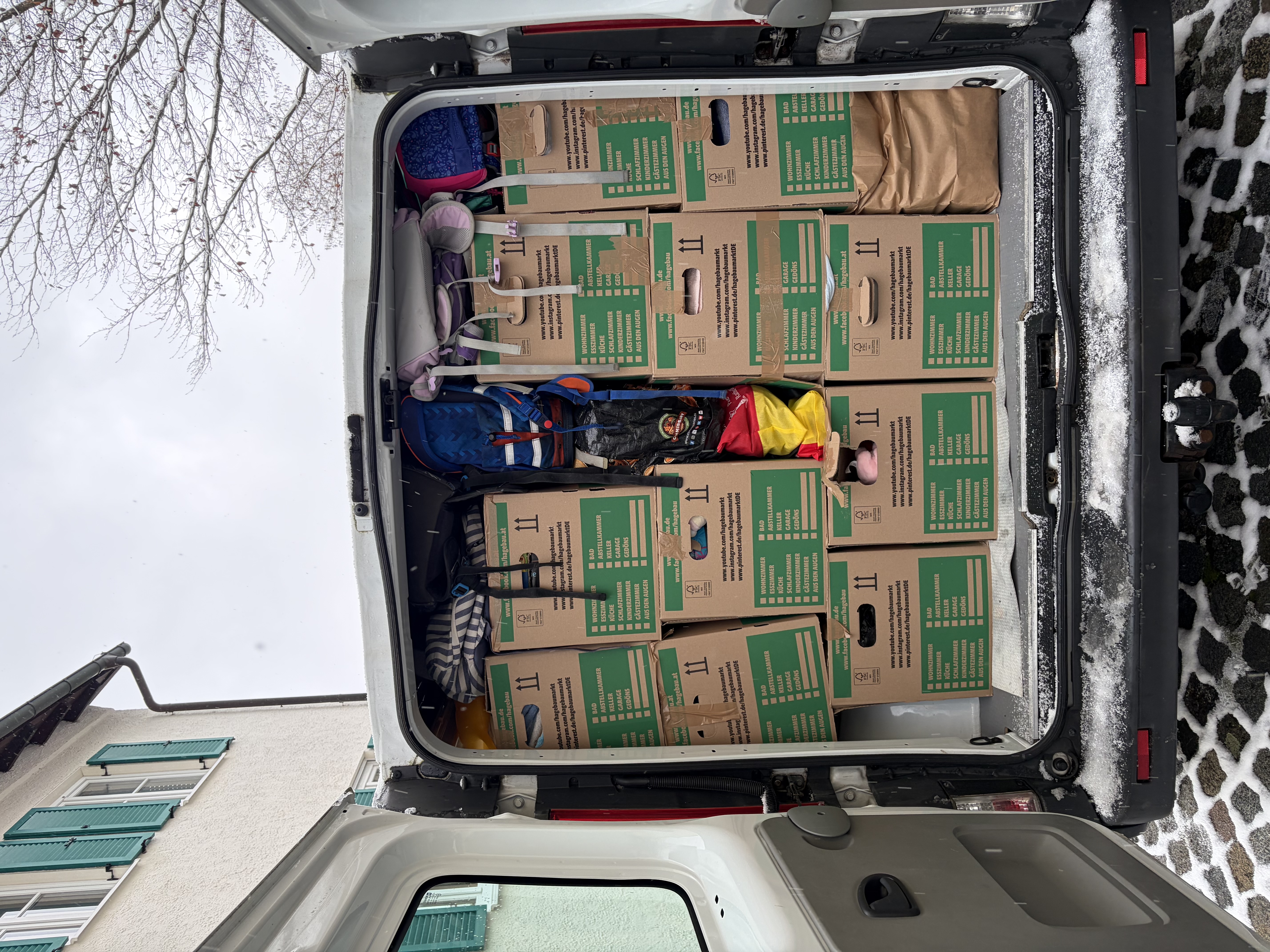 Während Decken, Lebensmittel, Spielzeug, Straßenmalkreiden, Socken, Schals und Mützen mit Geschick verstaut wurden, konnten die schönen Schulrucksäcke einzeln transportiert werden. Schon vor dem eigentlichen Start der Aktion erreichte uns eine Spende aus Hohenpeißenberg: Frau Schuster hatte bewirkt, dass uns der Kindergartenförderverein von Hohenpeißenberg gesammeltes Spielzeug zukommen ließ. Vielen Dank dafür!
